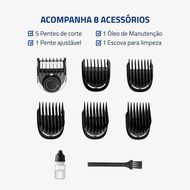 Pentes de Corte: O aparador acompanha 5 pentes removíveis com alturas de 3 mm, 6 mm, 9 mm, 12 mm e 15 mm, proporcionando opções para diferentes estilos.