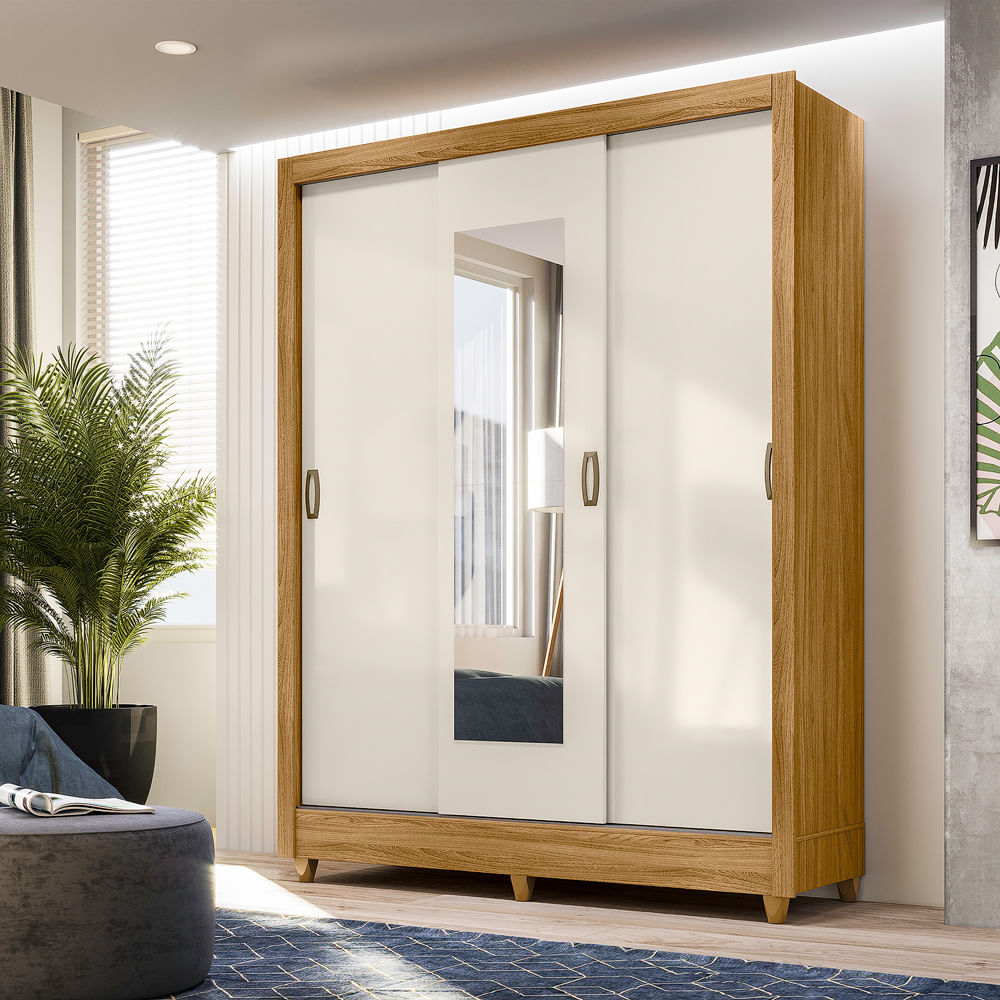 O Guarda Roupa em MDP GR Bolívia tem 3 portas deslizantes, perfeito para ocupar menos espaço em seu ambiente, tem 2 gavetas interna com corrediça metálica e logo abaixo um espaço para acomodar sapatos, um dos lados é exclusivo com prateleiras, enquanto o outro tem amplos bastões cabideiros em alumínio. A qualidade pode ser descrita pelo MDP de alta qualidade que compõe a sua estrutura e pelo revestimento em impressão UV.